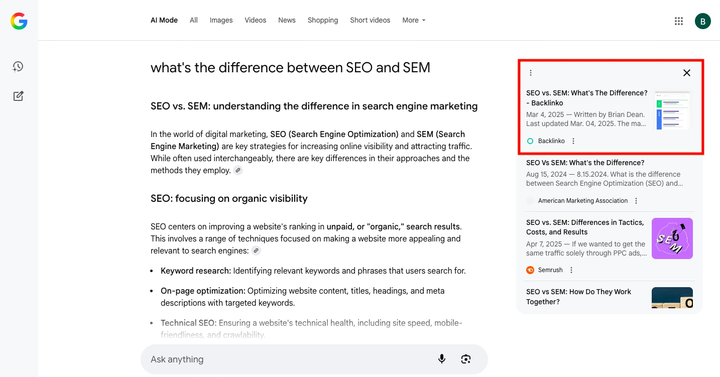 When you ask AI Mode to explain the difference between SEO and SEM, it often surfaces an article from Backlinko right at the top.