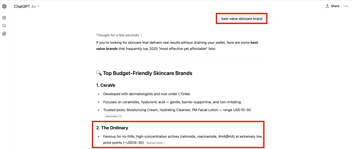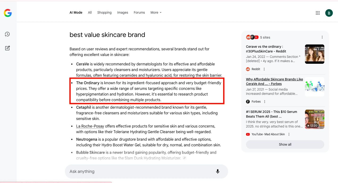 For example, when you search for “best value skincare brand” using AI Mode, it lists The Ordinary as one of the answers.