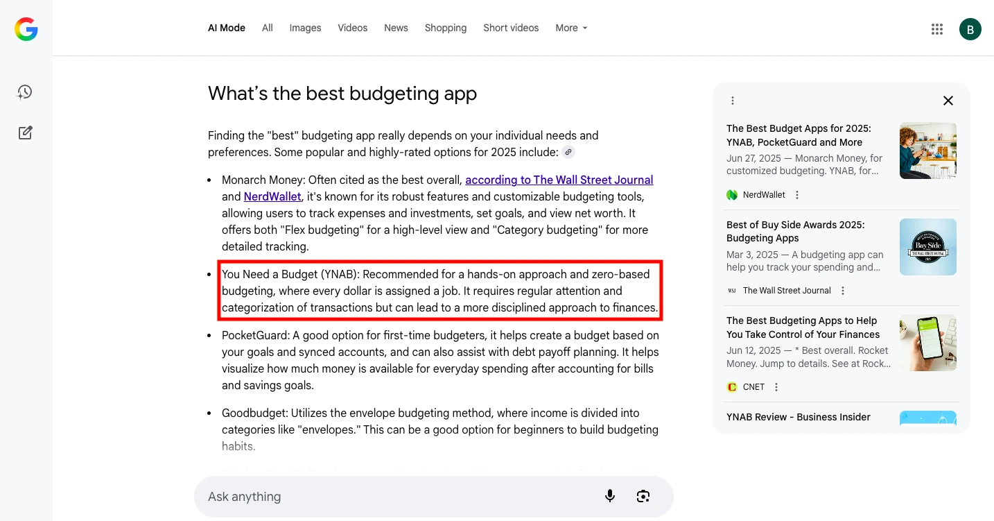 So now, when you search “What’s the best budgeting app” in Google’s AI Mode, YNAB often appears as a top recommendation.