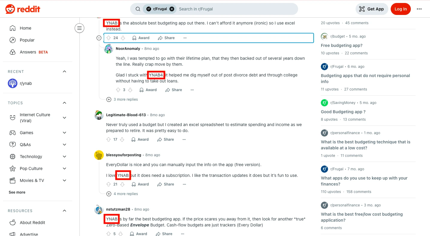 For example, YNAB (You Need A Budget) is frequently recommended by users in Reddit threads about personal finance. Over time, those consistent mentions have built strong brand associations that AI tools have picked up on.